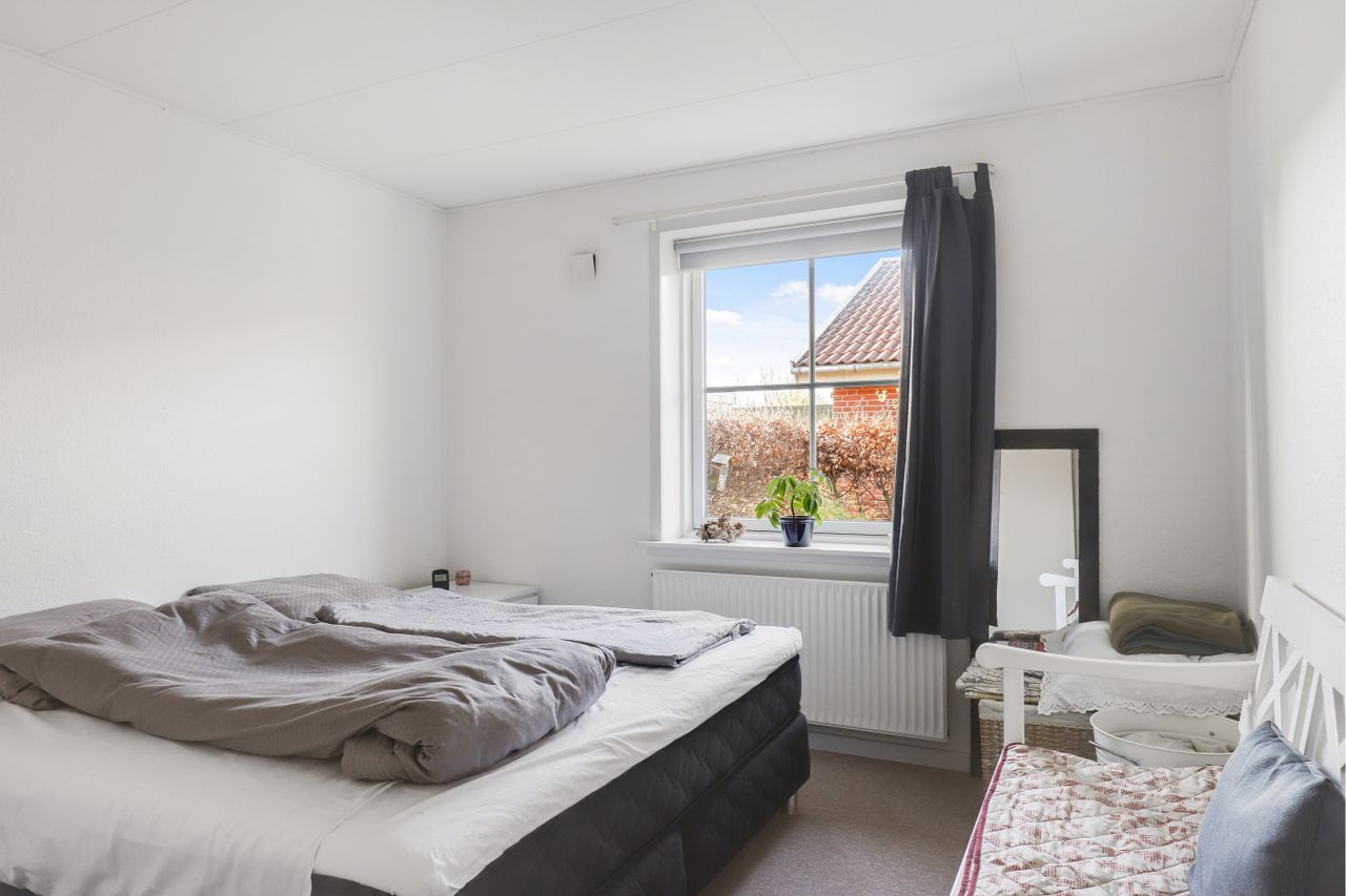 Dejligt stort lyst soveværelse med gulvtæppe, skabsvæg mv.