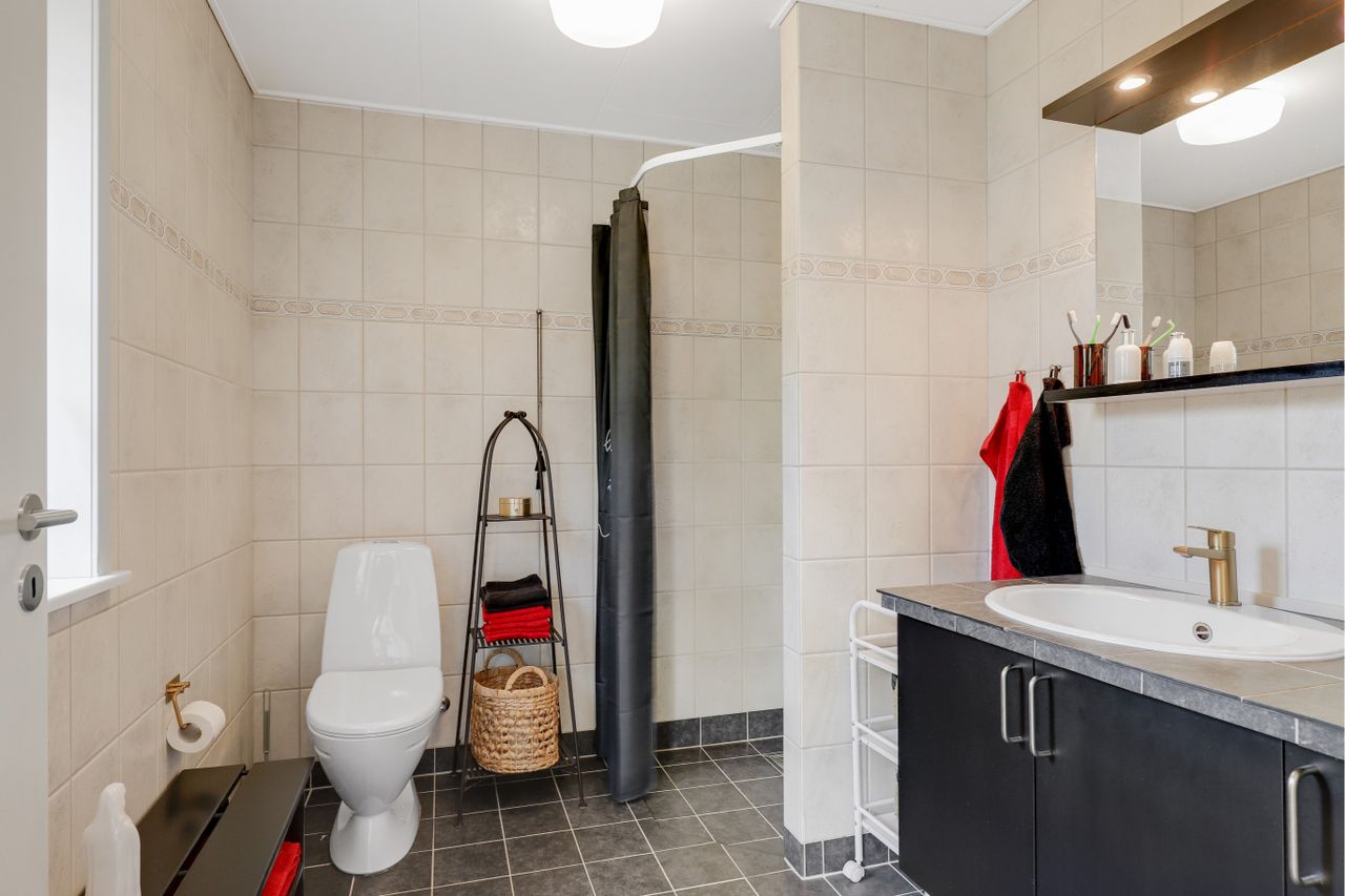 Pænt lyst badeværelse med flot mørkt klinkegulv, sep. bruseniche med lyse fliser på væggene, pænt