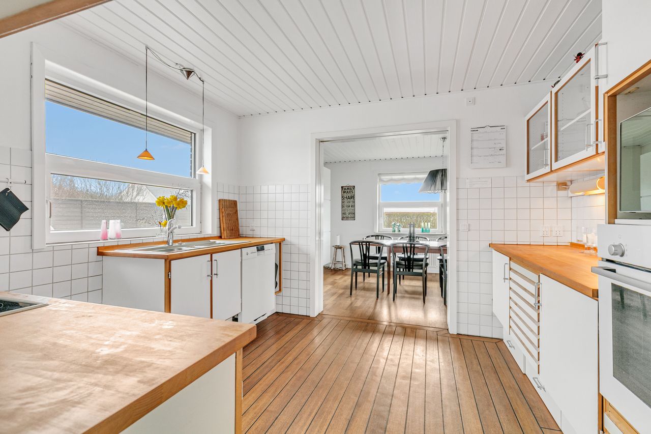 Nydeligt køkken, med hvide køkkenelementer, med trækanter, træbordplade og sokkel skuffer, endvidere er der pålagt et skibsdæksgulv og der er dobbelt fransk skydedørslåger isat til spisestuen.